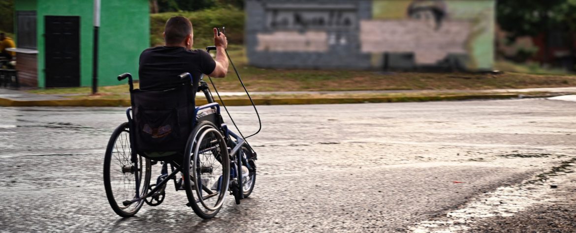 El caso de Kenny Lionel Daboín Bastidas nos llamó la atención desde el principio por varias razones. Una de ellas era al principio una simple curiosidad: se trata de un hombre joven con una condición de discapacidad (o condición especial, según la terminología del momento) que le impide ponerse de pie y caminar, pero que ha suplido esa limitación con un artefacto para moverse por las calles: una especie de bicicleta adaptada o silla de ruedas modificada para que el usuario pueda “pedalear” con las manos.