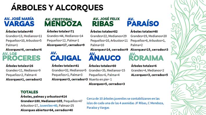 La idea de hacer un catálogo de árboles se concretó a raíz de un inconveniente particular; los árboles más grandes y viejos, en su búsqueda natural de agua y oxígeno, levantaron varias aceras con sus raíces. Este daño estructural representa una contrariedad para los habitantes de la comunidad: “los viejitos no pueden caminar, la gente discapacitada tampoco, hasta yo me he caído. Es un tema, y decidimos que ese era un proyecto prioritario. La alcaldía toma esa iniciativa como único proyecto de planificación y nos exige un censo rápido, de árboles, para conocer dónde se requería hacer la poda, el mantenimiento, entonces allí comenzó un poco todo lo que sucedió luego con el catálogo”.