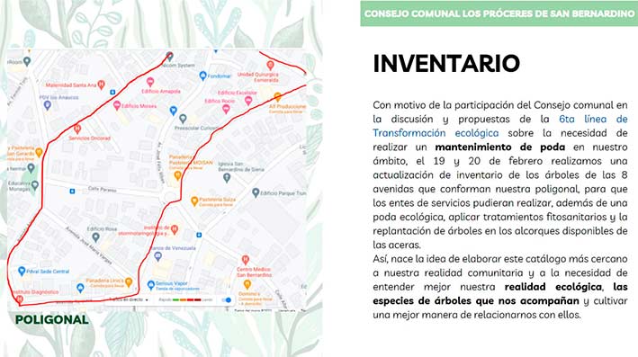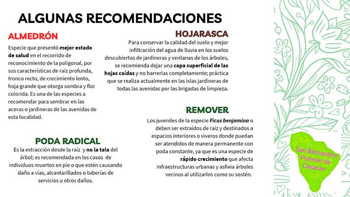 Mailén Riveros, bióloga y vocera del Consejo Comunal Los Próceres de San Bernardino, lidera una iniciativa que promueve el cuidado y el mantenimiento ecológico de los numerosos árboles que coexisten con los miembros de esa comunidad. Junto a Luís Felipe Gottopo (antropólogo), José Ramírez (ecologista) y Ernesto Muñoz (agrourbano), la investigadora y ambientalista diseñó un catálogo en el que registró la población arbórea que conforma la poligonal. “San Bernardino es una zona muy arbolada, muy bonita, siempre había estado pendiente de que ya se había hecho un censo (de árboles). Hace mucho tiempo se hizo, están todavía algunos árboles identificados en el suelo desde ese censo. Entonces empezamos a buscarlo y quién lo había hecho, pero al final nunca lo tuvimos materialmente. Me cansé de esperar y decidimos hacerlo de nuevo”.