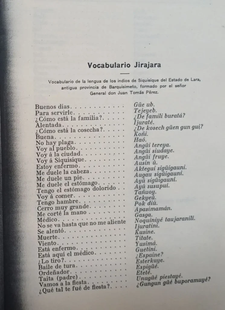 En 1910 el investigador Alfredo Jahn registró unas cuantas voces de lenguas indígenas que ya estaban a punto de extinguirse de la memoria de la gente, a causa de la criollización de todo, empezando por el lenguaje. El investigador realizó varios viajes por poblados donde quedaban grupos o personas hablantes de las lenguas de pueblos originarios. La piel se me eriza cuando descubro en ese trabajo del profesor Jahn una voz jirajara, que una hablante de la lengua le dijo a otro compilador que significaba o equivalía a «buenos días». Léanla ahí: