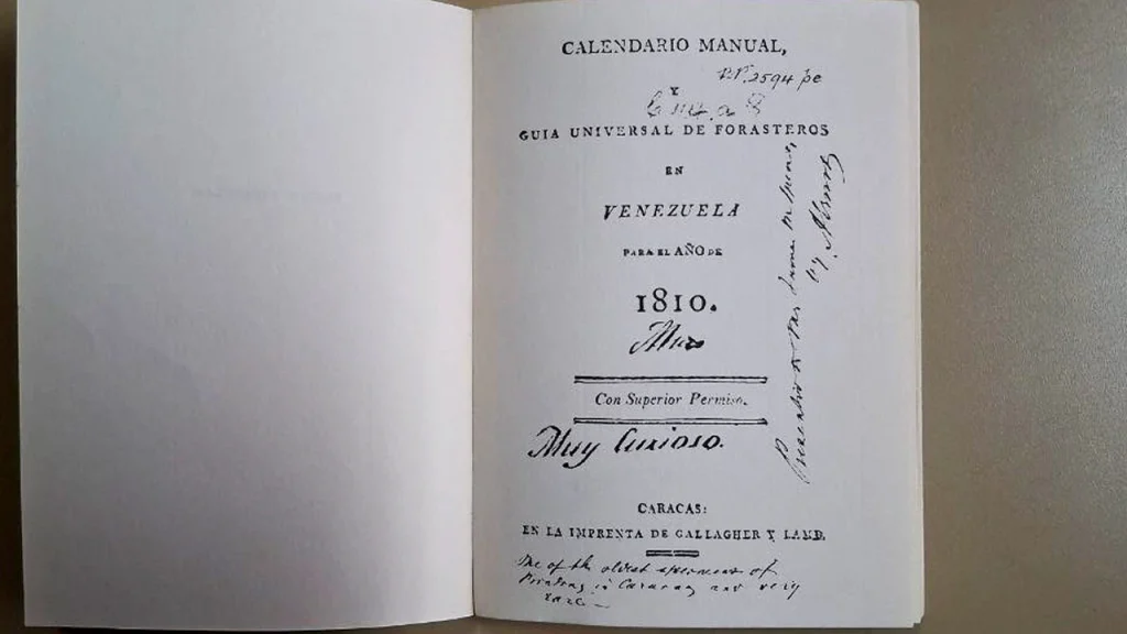 De la mencionada colección proviene un ejemplar original considerado una joya entre los libros raros de la Biblioteca Nacional. Es uno de los tres o cuatro que existen en el mundo. El “Calendario manual, y Guía Universal de forasteros en Venezuela”, escrito por Andrés Bello, es el primer libro editado en Venezuela, por la imprenta de Gallagher y Lamb, en 1810. Las pesquisas nos condujeron a esta rareza.