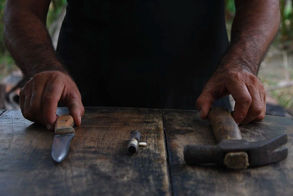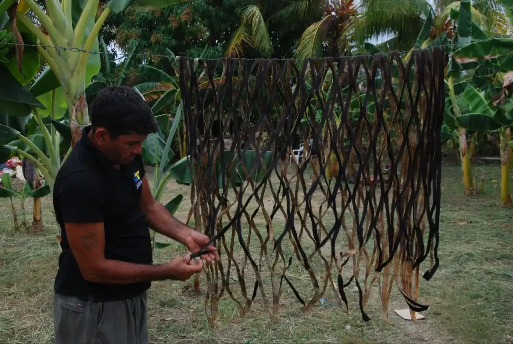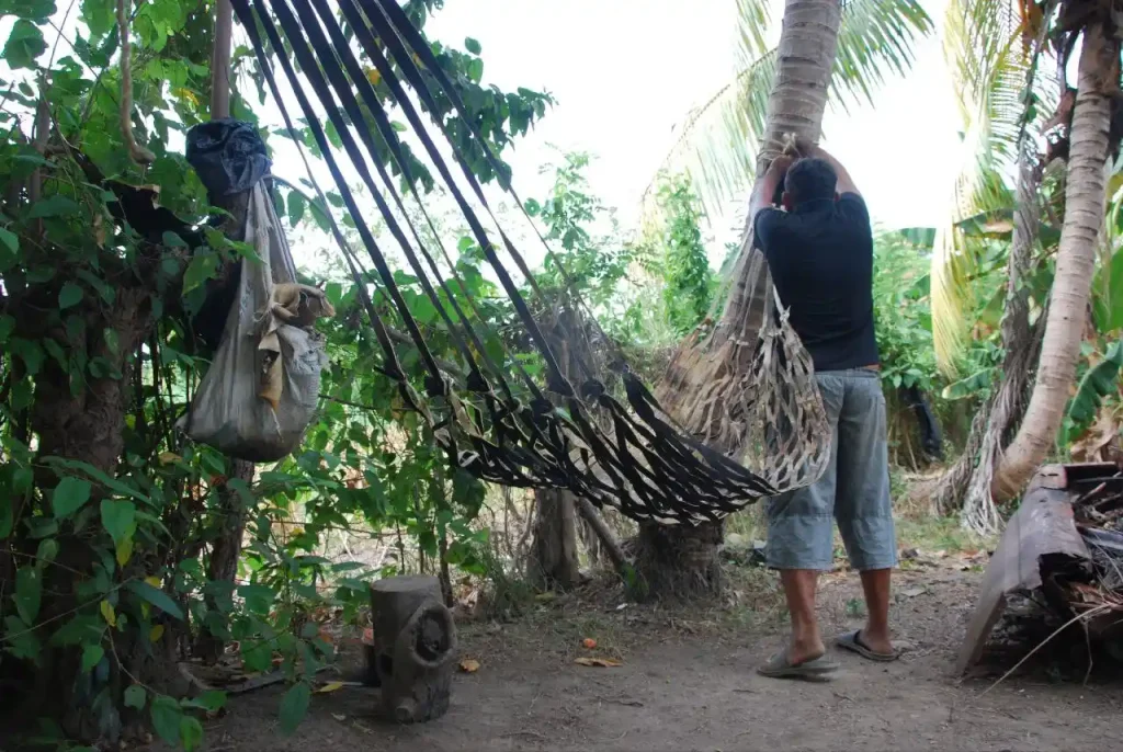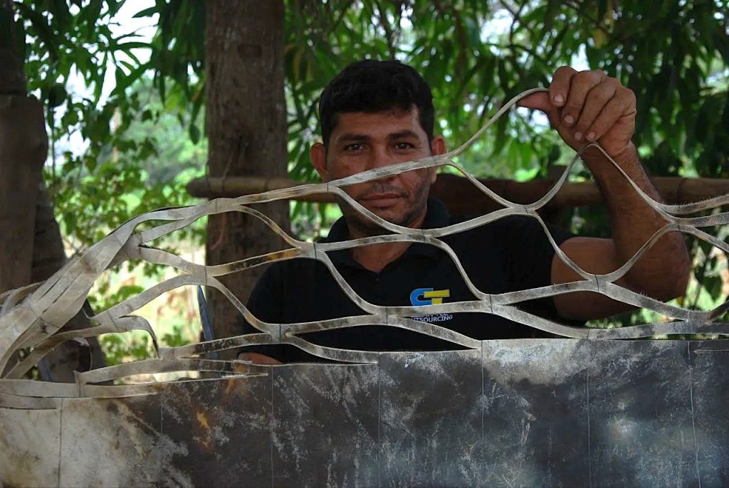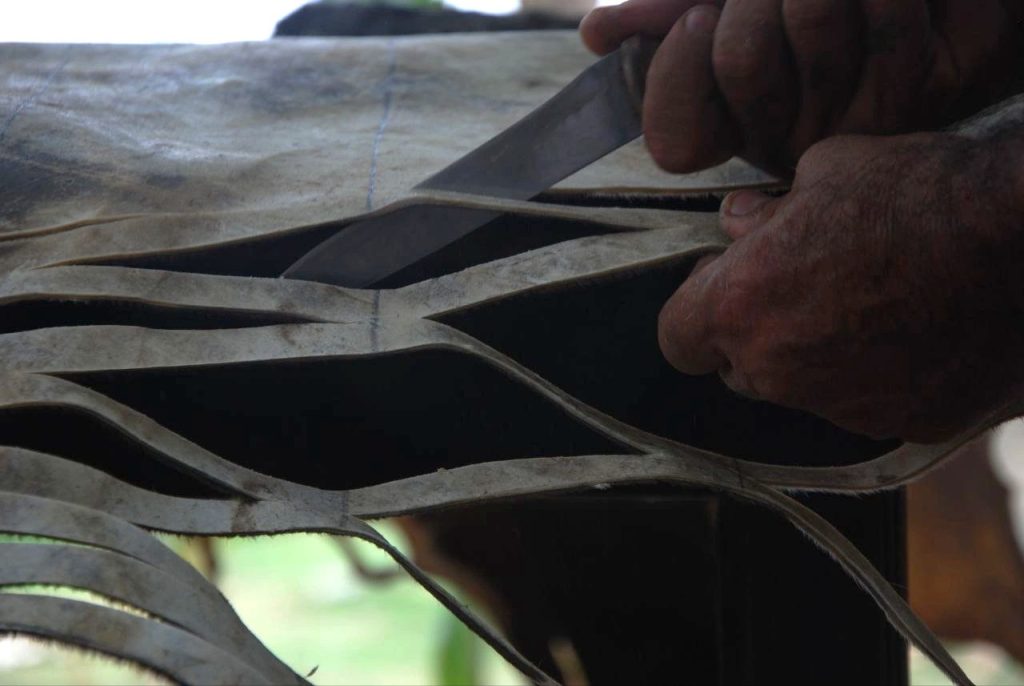 Seco el cuero, templado y rayado se pica el tercer día. Por donde están las marcas José hunde el cuchillo y va cortando, guiándose por las líneas, hasta que saca la cuadricula completa. Del mismo cuero saca las cabuyeras entorchadas que permiten guindar la hamaca. Las cabulleras llevan un soporte que es un cuadro de cuero doblado al que José le abre unos huecos con un troquel y un martillo. Luego la arma. Terminado el trabajo lava la hamaca con jabón.