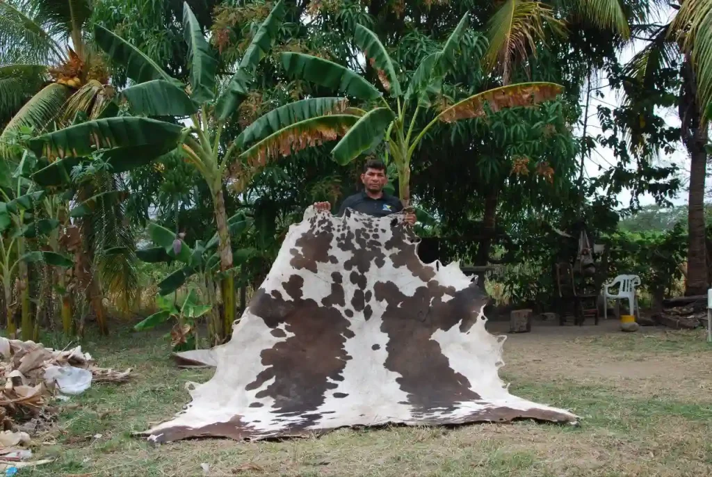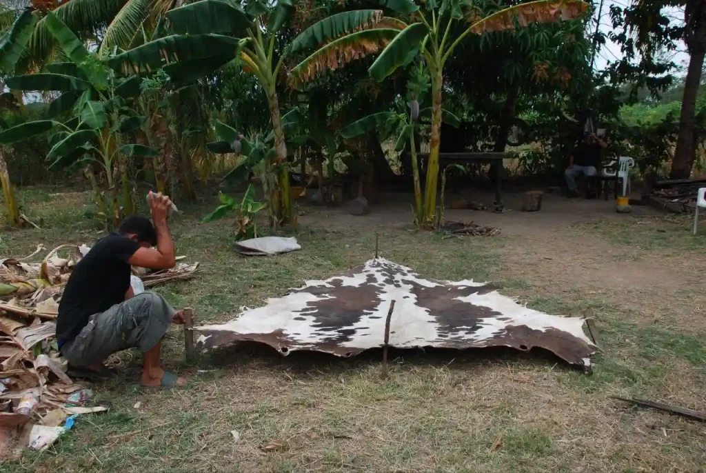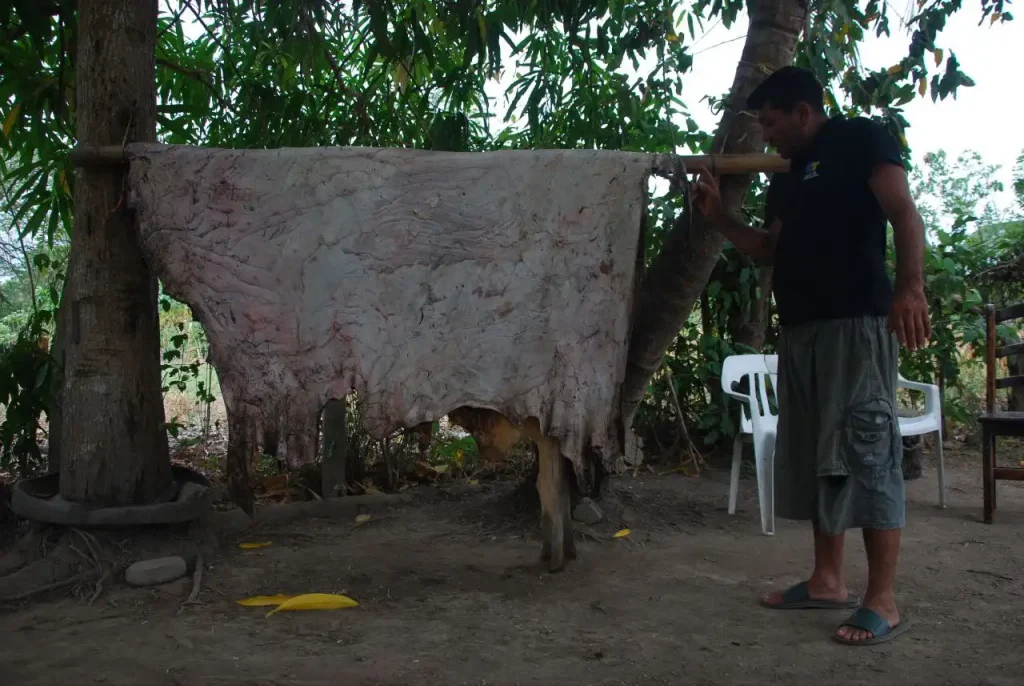 Con un cuchillo afilado José arranca a limpiar el cuero fresco guindado en la guafa. Con destreza le quita los pellejos, los restos de carne y de grasa. Hecho esto, con el mismo cuchillo le abre huecos por las orillas, le pone mucha sal para empezar a curarlo y lo “embota” o dobla, para que agarre mejor la sal. La cantidad de sal está entre dos y tres kilos dependiendo del tamaño del cuero, si es de un animal de 400, 500, 700 u 800 kilos.