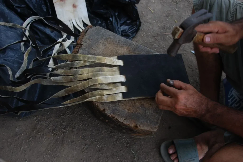 Volvamos al punto de la elaboración. El primer día se compra el cuero, se despelleja, se le abren los huecos, se sala. El día siguiente se extiende, se estaca para templarlo y se deja todo el día al sol para que se seque bien.