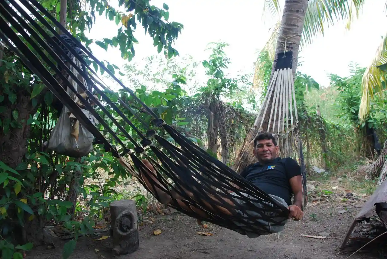 Seco el cuero, templado y rayado se pica el tercer día. Por donde están las marcas José hunde el cuchillo y va cortando, guiándose por las líneas, hasta que saca la cuadricula completa. Del mismo cuero saca las cabuyeras entorchadas que permiten guindar la hamaca. Las cabulleras llevan un soporte que es un cuadro de cuero doblado al que José le abre unos huecos con un troquel y un martillo. Luego la arma. Terminado el trabajo lava la hamaca con jabón.