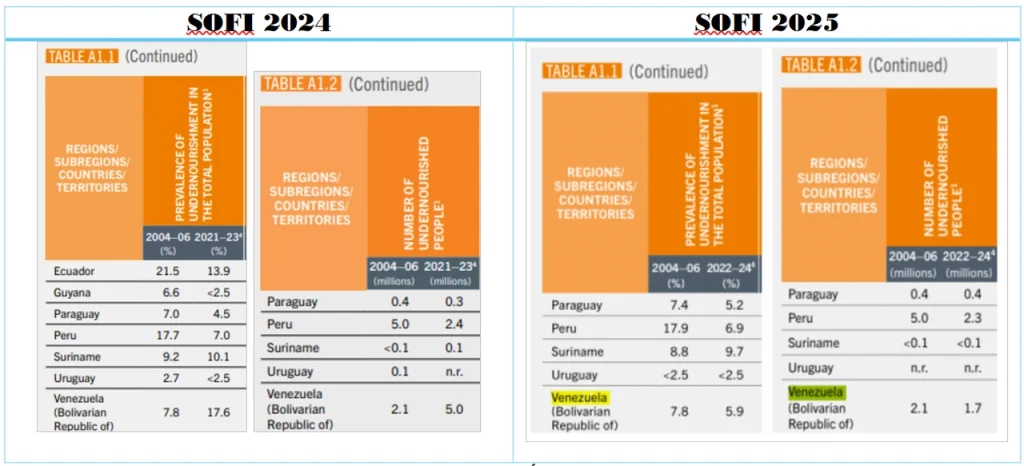 Fuente: FAO. Informe del Estado de la Seguridad Alimentaria y la Nutrición en el Mundo, años 2004-2025. MINPPAL – Instituto Nacional de Nutrición (INN)