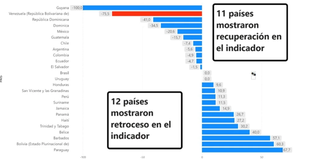 Variación de la Prevalencia de la Subalimentación en América Latina y el Caribe. % del IPS 2018-2020 al 2019-2024. Fuente: FAO. Informe del Estado de la Seguridad Alimentaria y la Nutrición en el Mundo, años 2004-2025