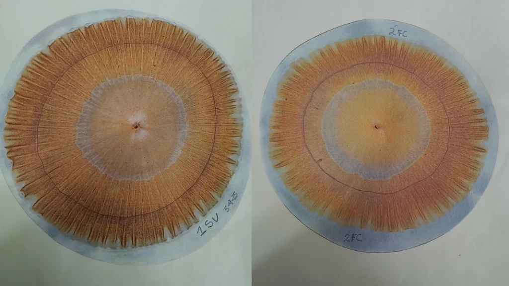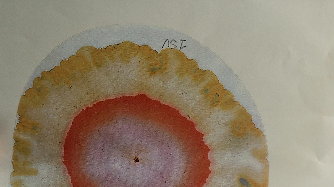 El cromatograma no es un gráfico, más bien parece una obra de arte. Se forma en círculos concéntricos, como los anillos de un árbol o las ondas de una piedra lanzada al agua. Cada anillo es una voz distinta del suelo: en la zona central tenemos al corazón microbiano, aquí late la vida invisible. Cuanto más amplia y luminosa sea esta zona, mayor es la actividad microbiana ¿Un corazón pequeño y apagado? El suelo está dormido… o enfermo.